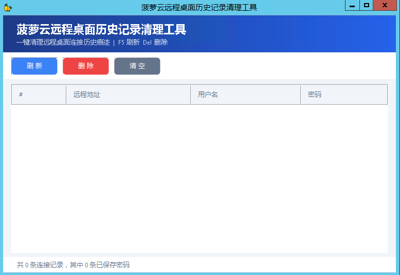 由菠萝云公司开发的一款用于清理本地电脑连接远程桌面历史记录的绿色免费工具,可以清理曾经连接过的远程桌面IP地址,和用户名等信息,假如您使用公共场所电脑连接您的远程电脑,在Windows电脑系统默认远程桌面连接软件会留下您的连接记录,该工具可以清理掉这些记录,避免被人利用窥探隐私。该软件绿色小巧使用很方便!